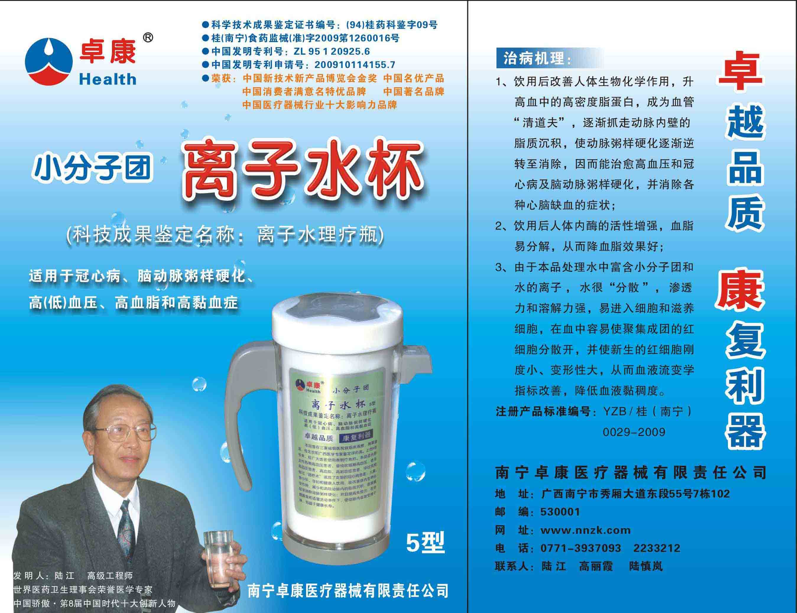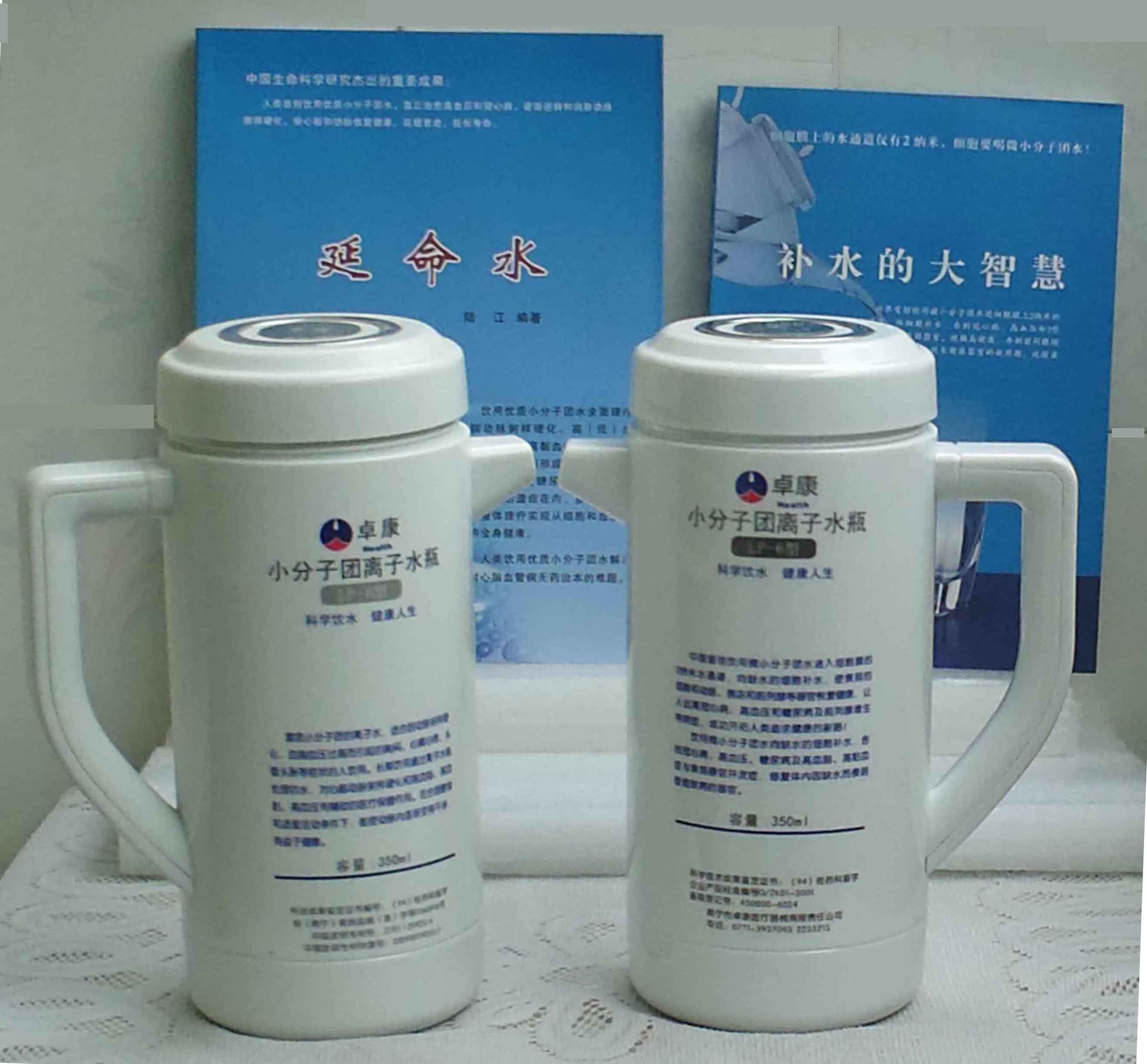 本品大量用戶的使用效果表明,能治愈冠心病、腦動脈硬化、原發(fā)性高(低)血壓、高血脂、高粘血癥、高血尿酸癥(痛風)和2型糖尿病、衰弱器官并發(fā)癥(前列腺增生、腎衰與尿毒癥)及中風后遺癥等療效好。產品配信譽卡。使用壽命30年,不換芯,易清洗。團購優(yōu)惠。從郵局匯款,匯費1%,地址按本頁下方地址、聯系人寫。從銀行匯款,請點擊[聯系匯款]欄,從工商銀行匯款,建設銀行、農業(yè)銀行匯款,均免收匯費,匯款后20--30分鐘內發(fā)短信,可用微信轉帳,均免匯費,微信號即手機號13768308380。匯款后,告知你的姓名和地址,我公司聯系人手機號是:13768308380卓康牌離子水瓶為我公司獨家生產,郵購產品配《補水的大智慧》彩印書一本,另配四季出版社出版的新書《補水的大智慧》一本,并配光盤一張(含央視主持人釆訪陸江的對話視頻)。目前市場和"淘寶網"上有人兜售假冒的偽品,望讀者審察辯別真?zhèn)危旒僬哓飧`假冒本公司的各種證、獲獎獎項、專利號和外包裝盒上的中英文字,包括科技成果的鑒定意見等,請讀者注意防偽。如何識別假貨?已經買了假貨怎么辦?(請點擊[打假掠影][打假掠影])。
